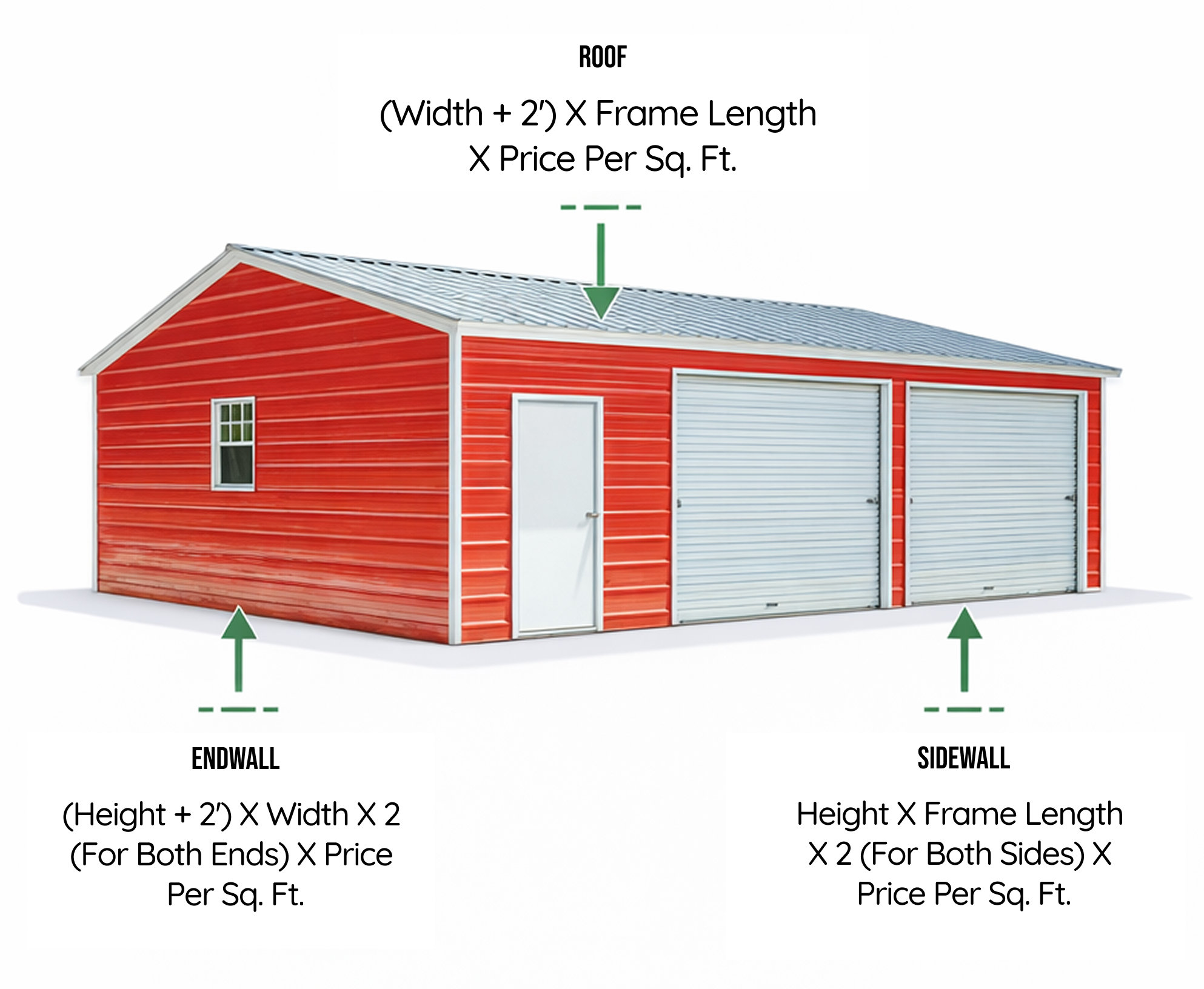 - Roof: (Width + 2’) × Frame Length × Price per Sq. Ft.